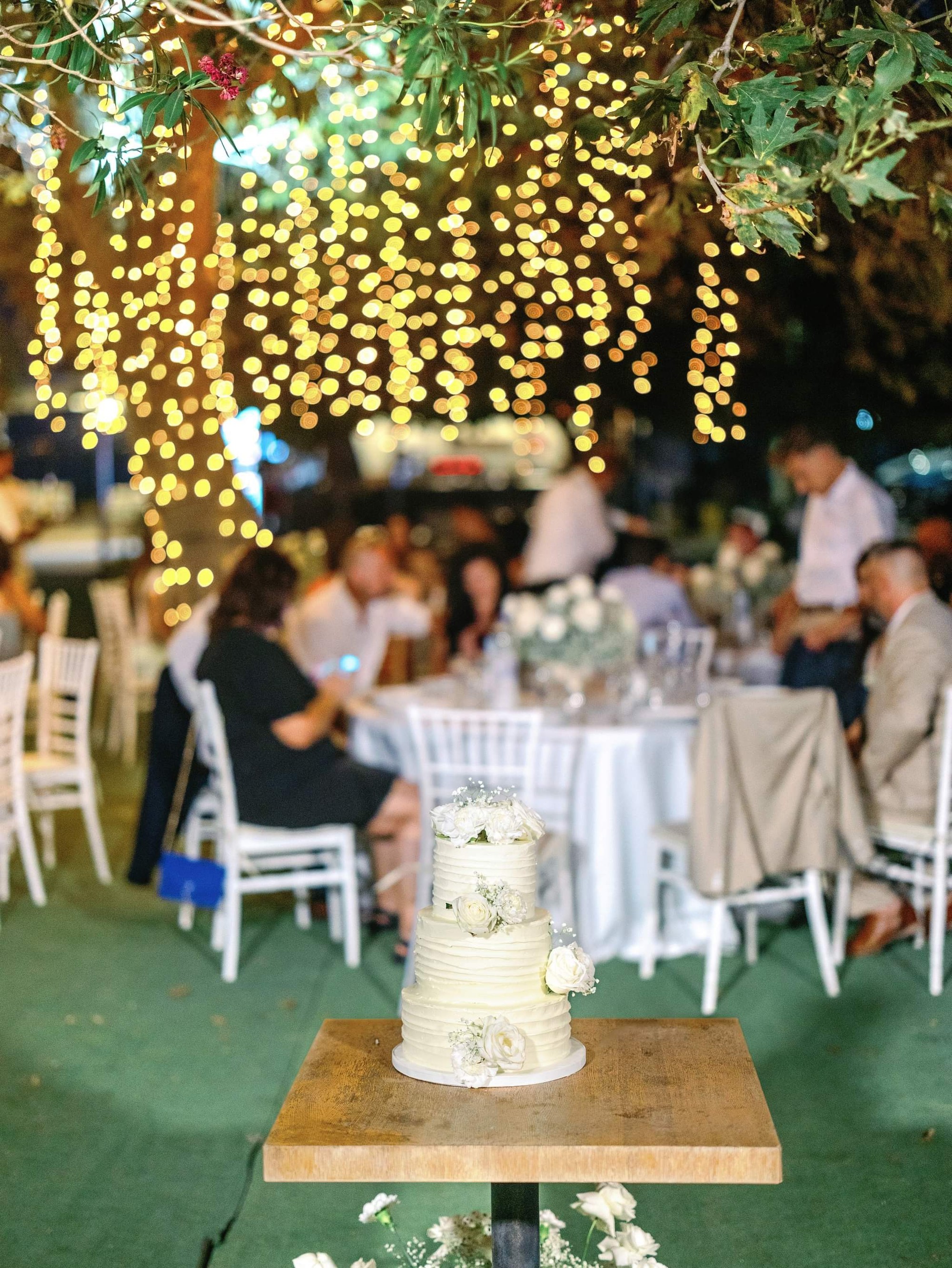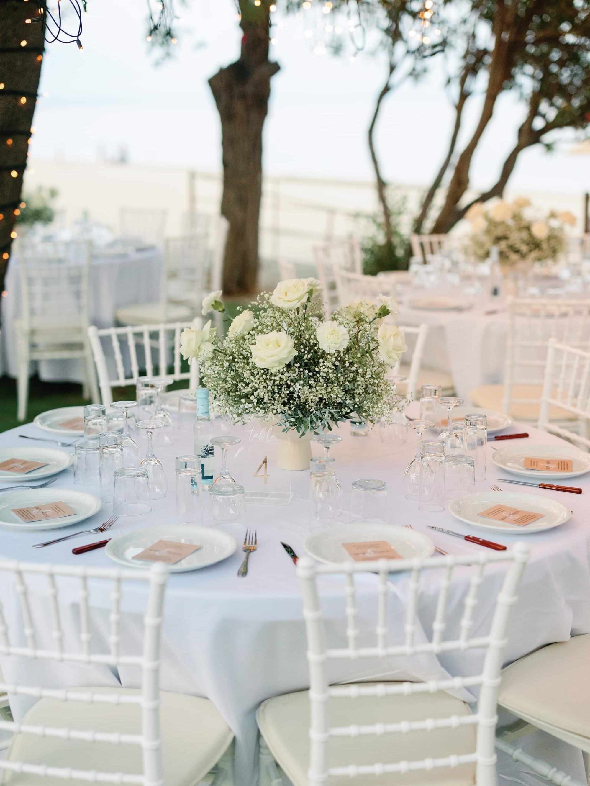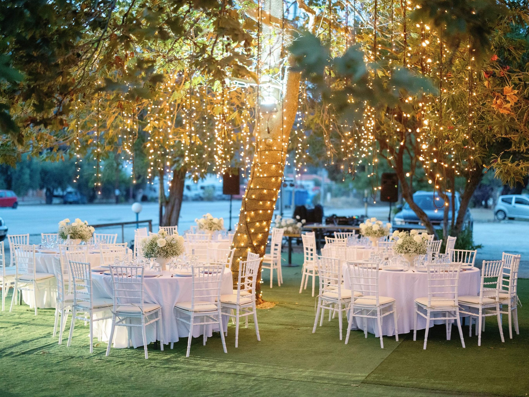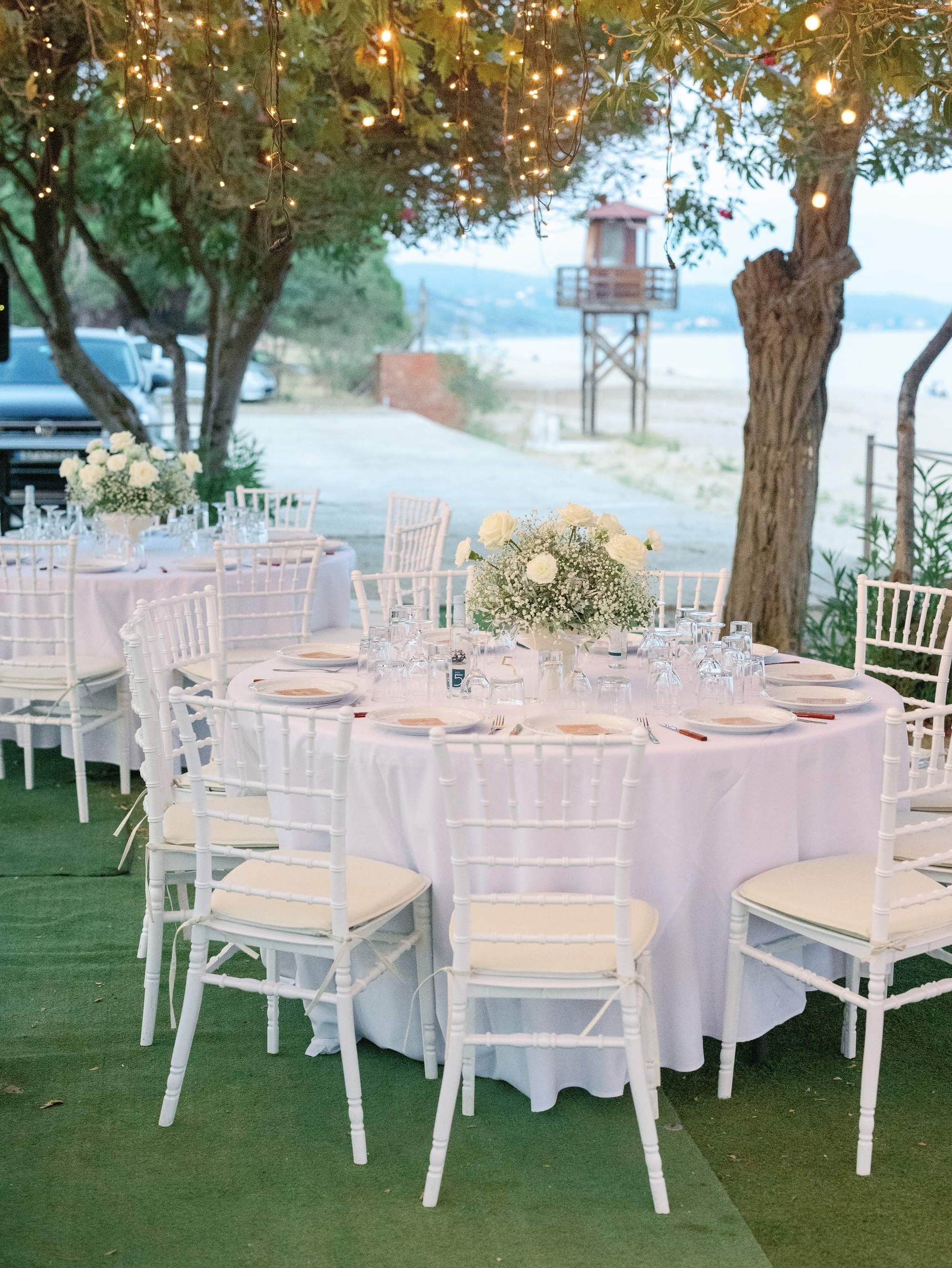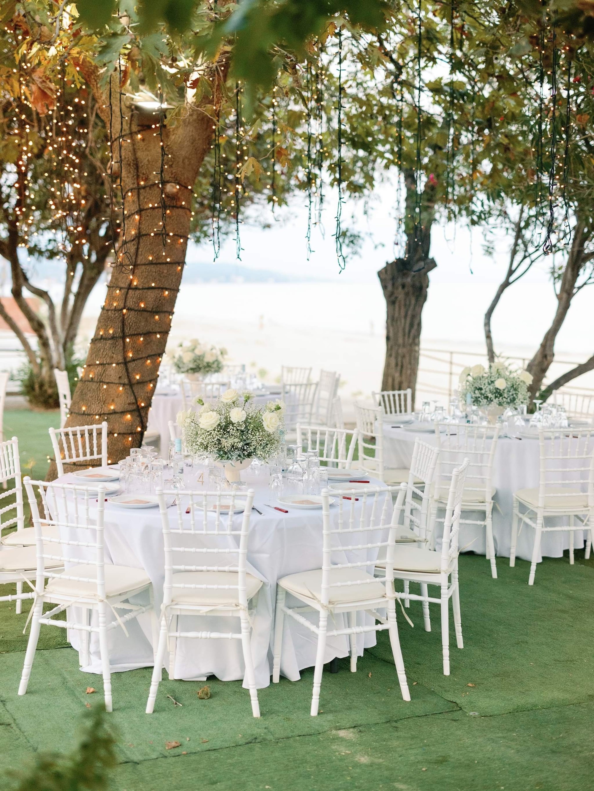 Athanasios and Katerina chose white roses and baby's breath for the most beautiful moment of their lives. An incredible scene was set up on the beach with lights on the trees. The party lasted until morning.
