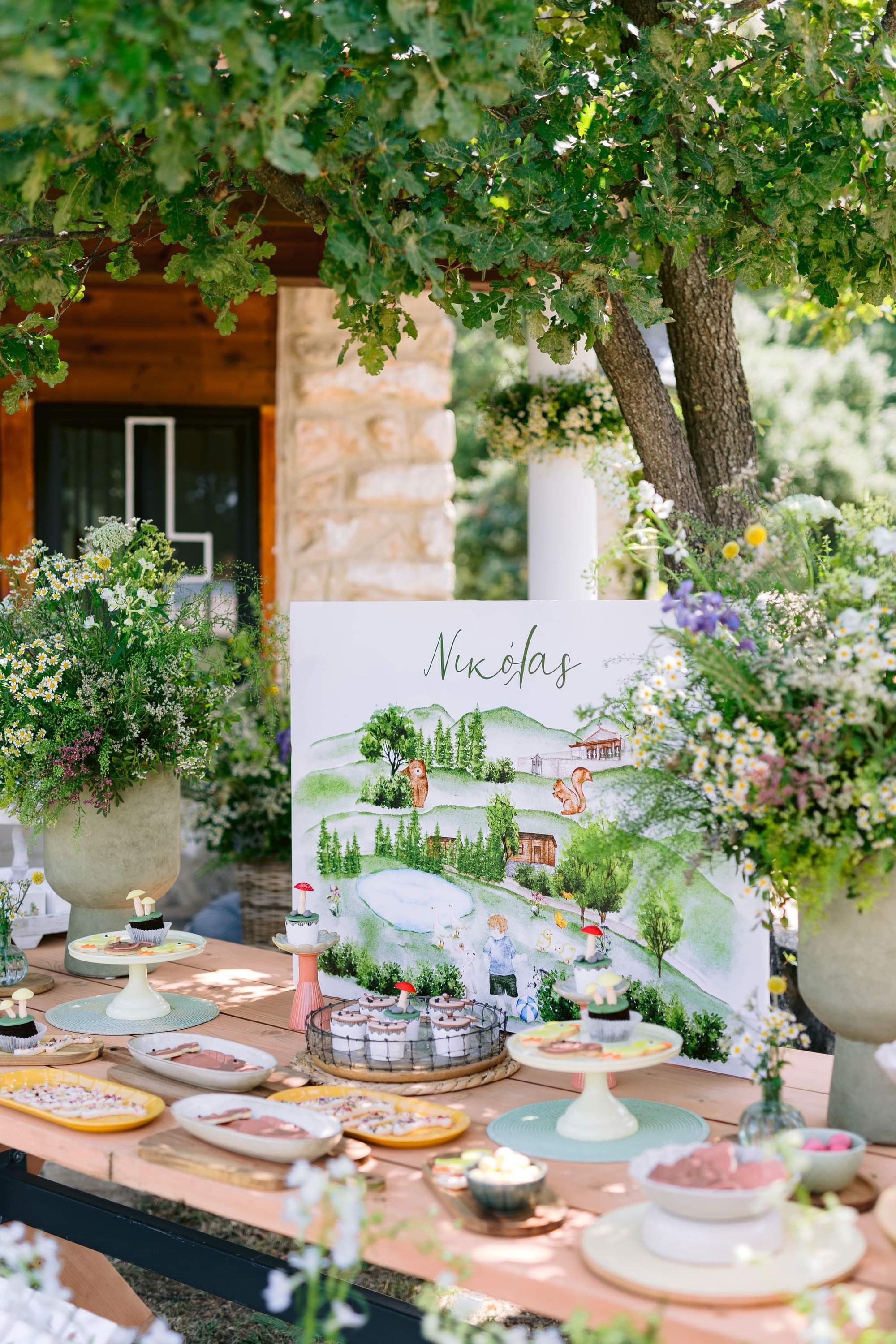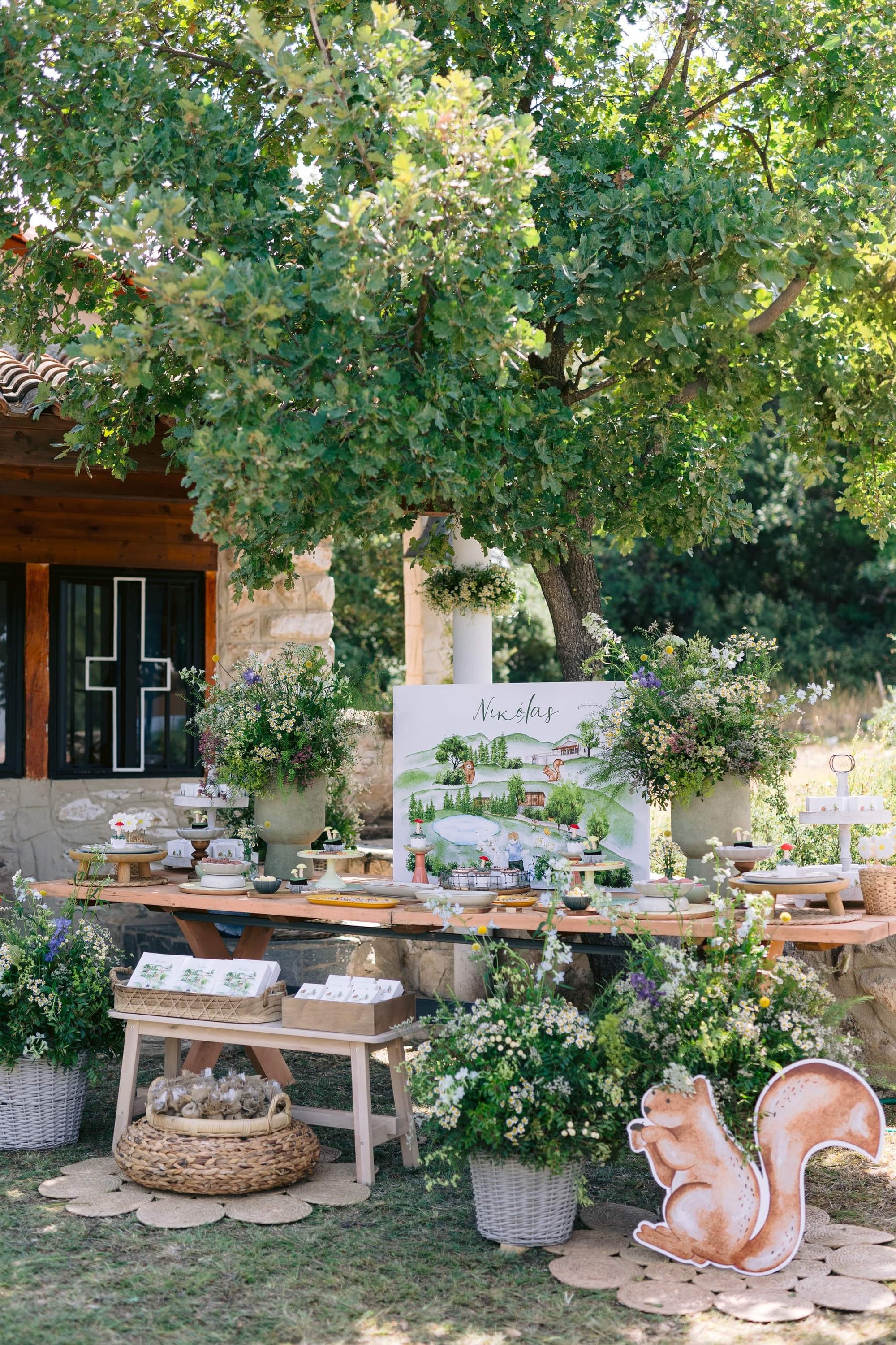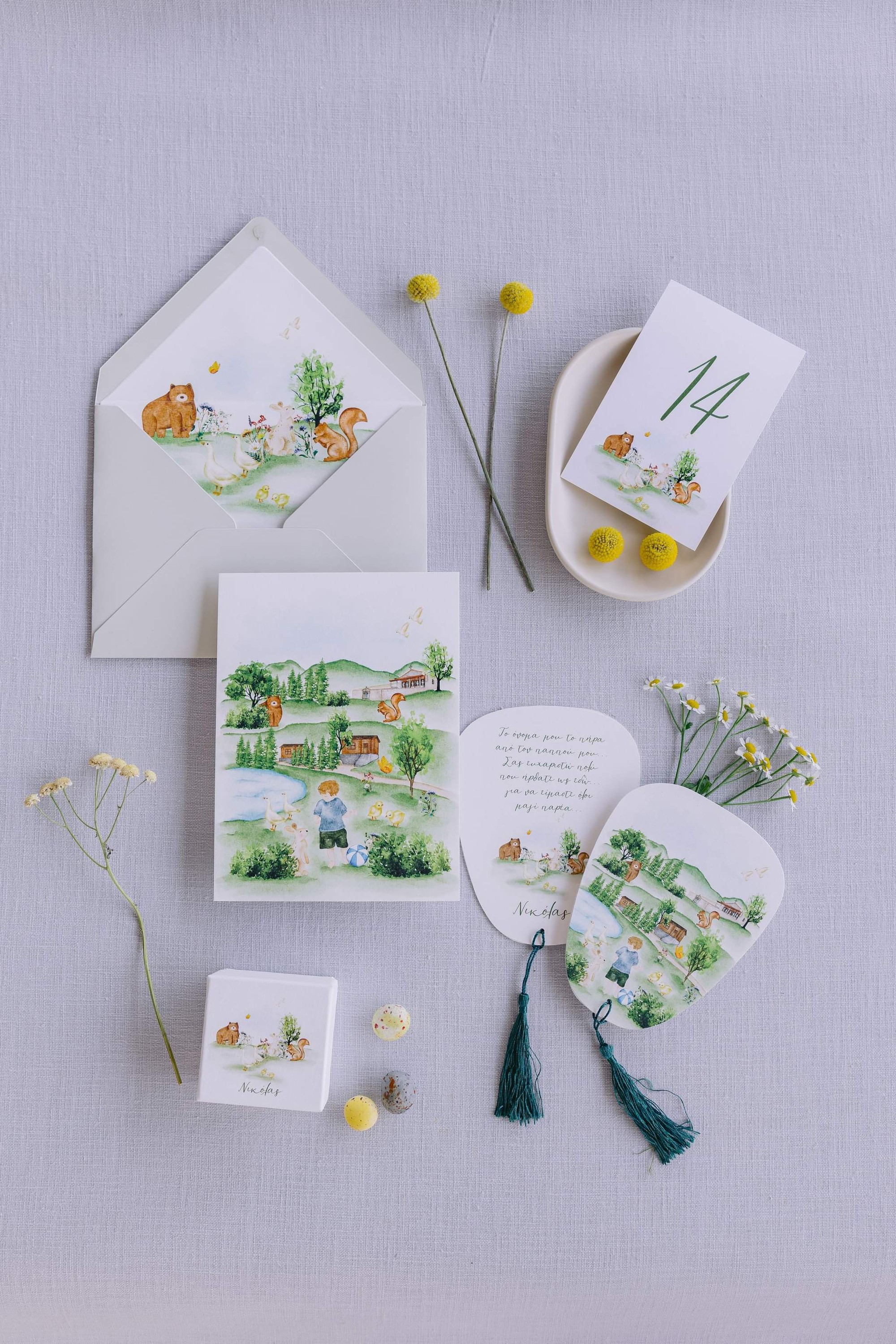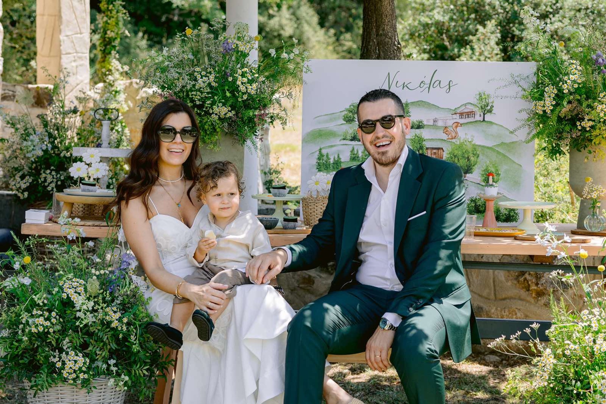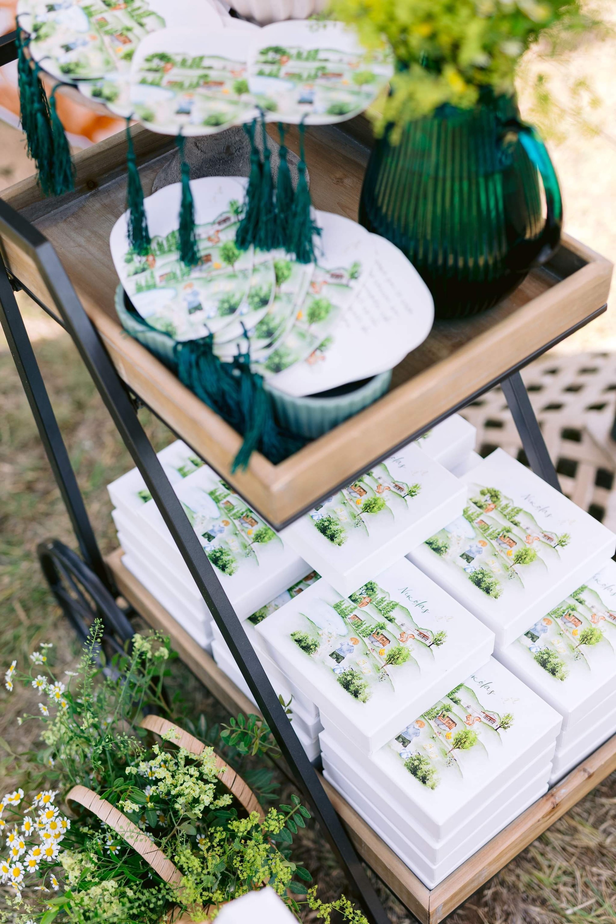 George and Micaela traveled to the beautiful Agistro of Serres, the birthplace of grandfather Nikos, to baptize their little son Nikolas. In the lush greenery of the wooden village, a picturesque chapel set the scene for a wonderful event with a refreshments and candy bar for their select guests. Micaela, the mother, wanted the baptism gifts to be unique: beautiful scarves with Nikolas' monogram for the women, boxes with sugar-coated almonds for the men, and large metal boxes filled with gifts for the children. The invitation and the favors were specially designed by Manousenia.