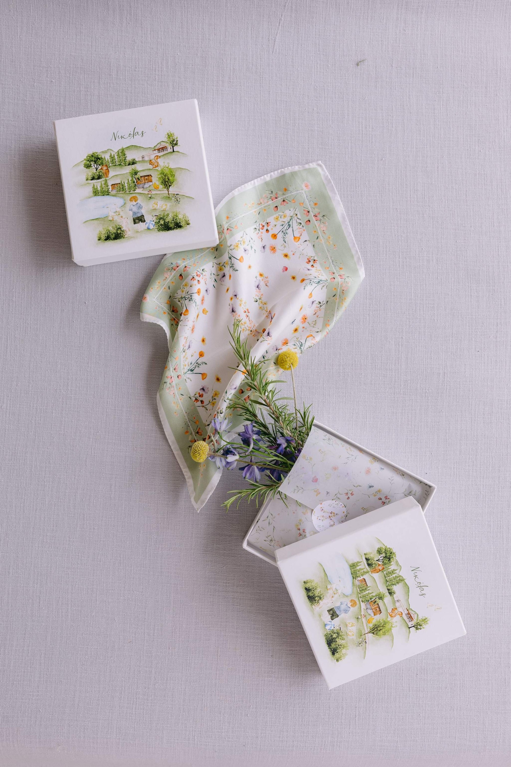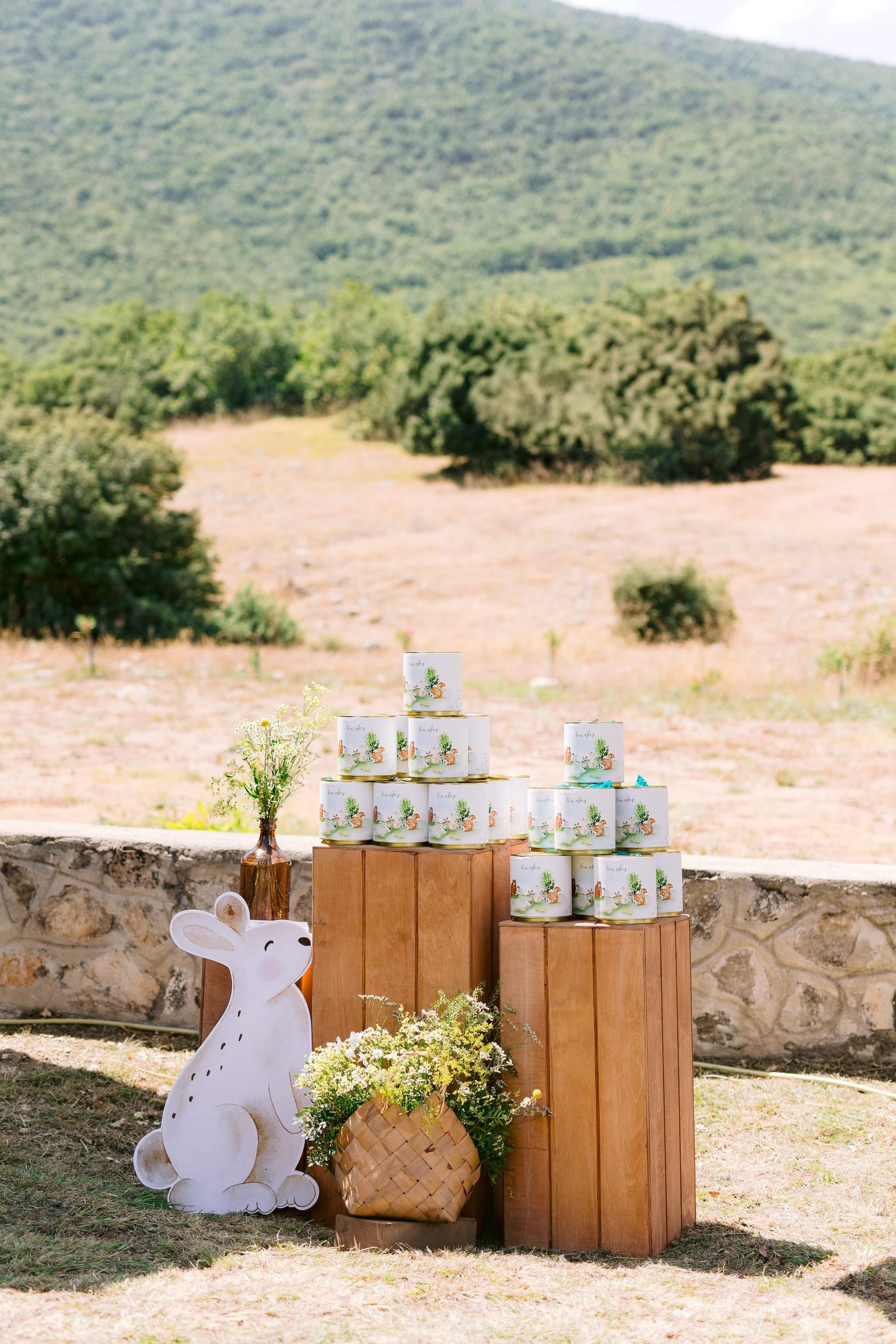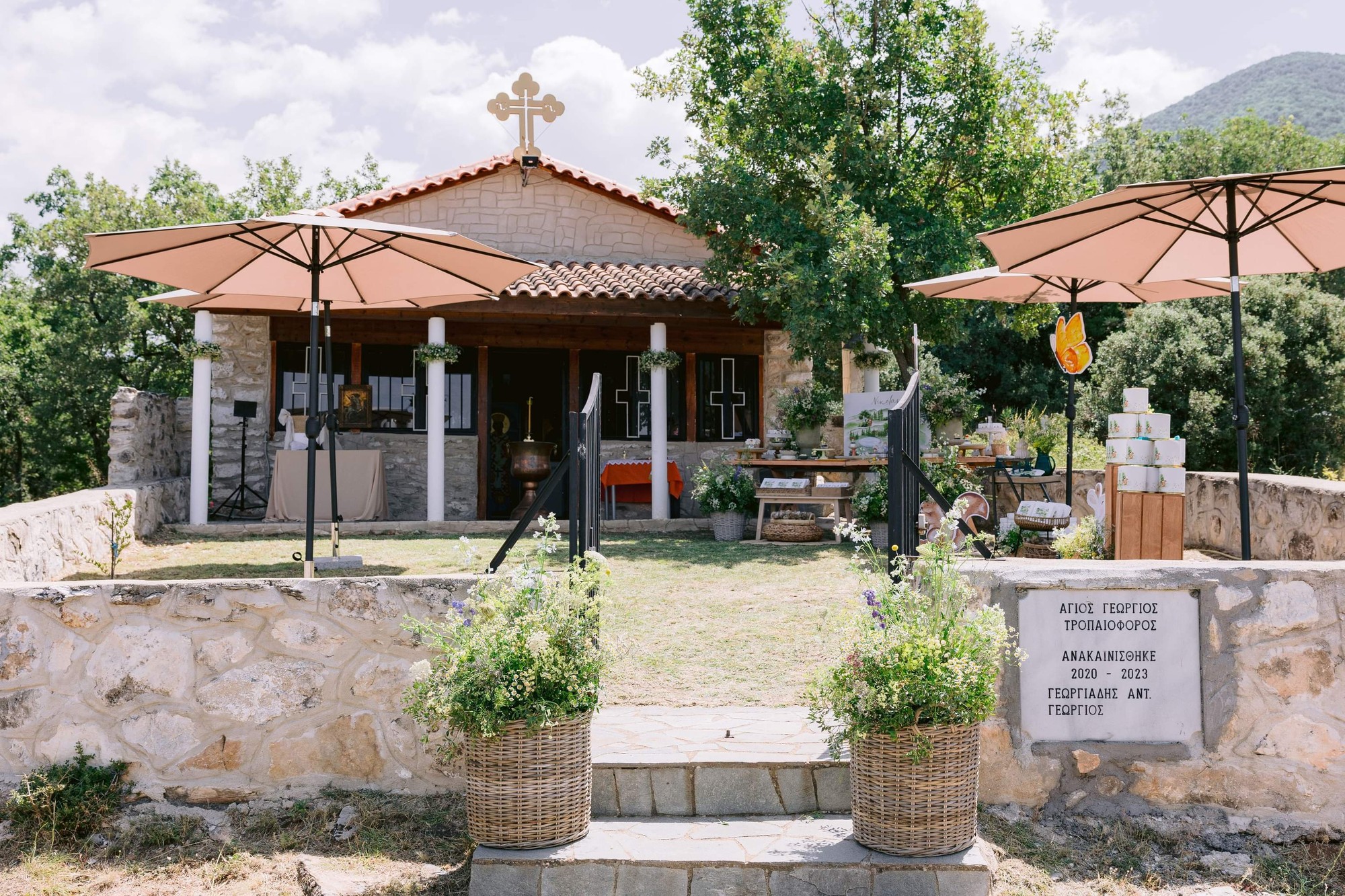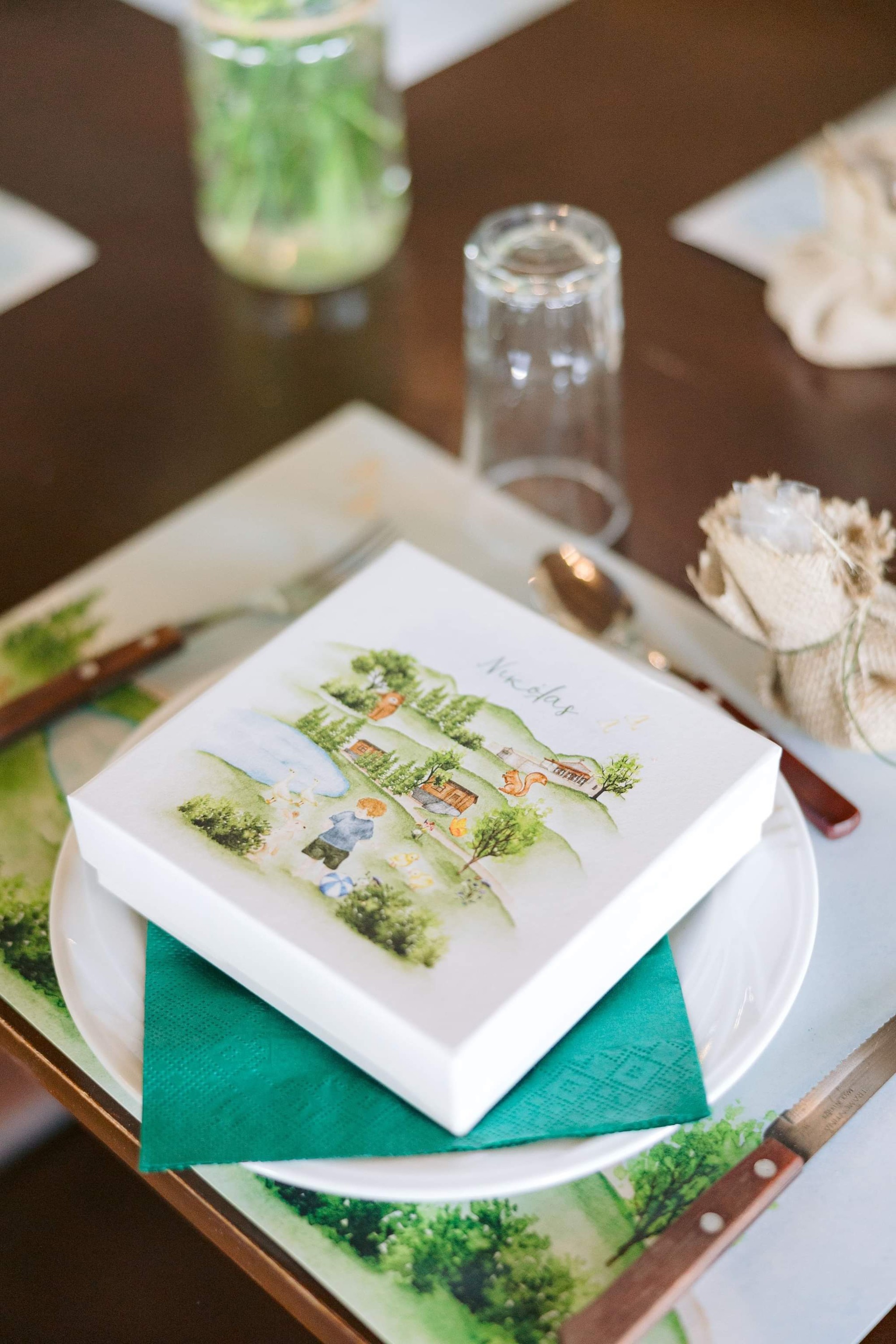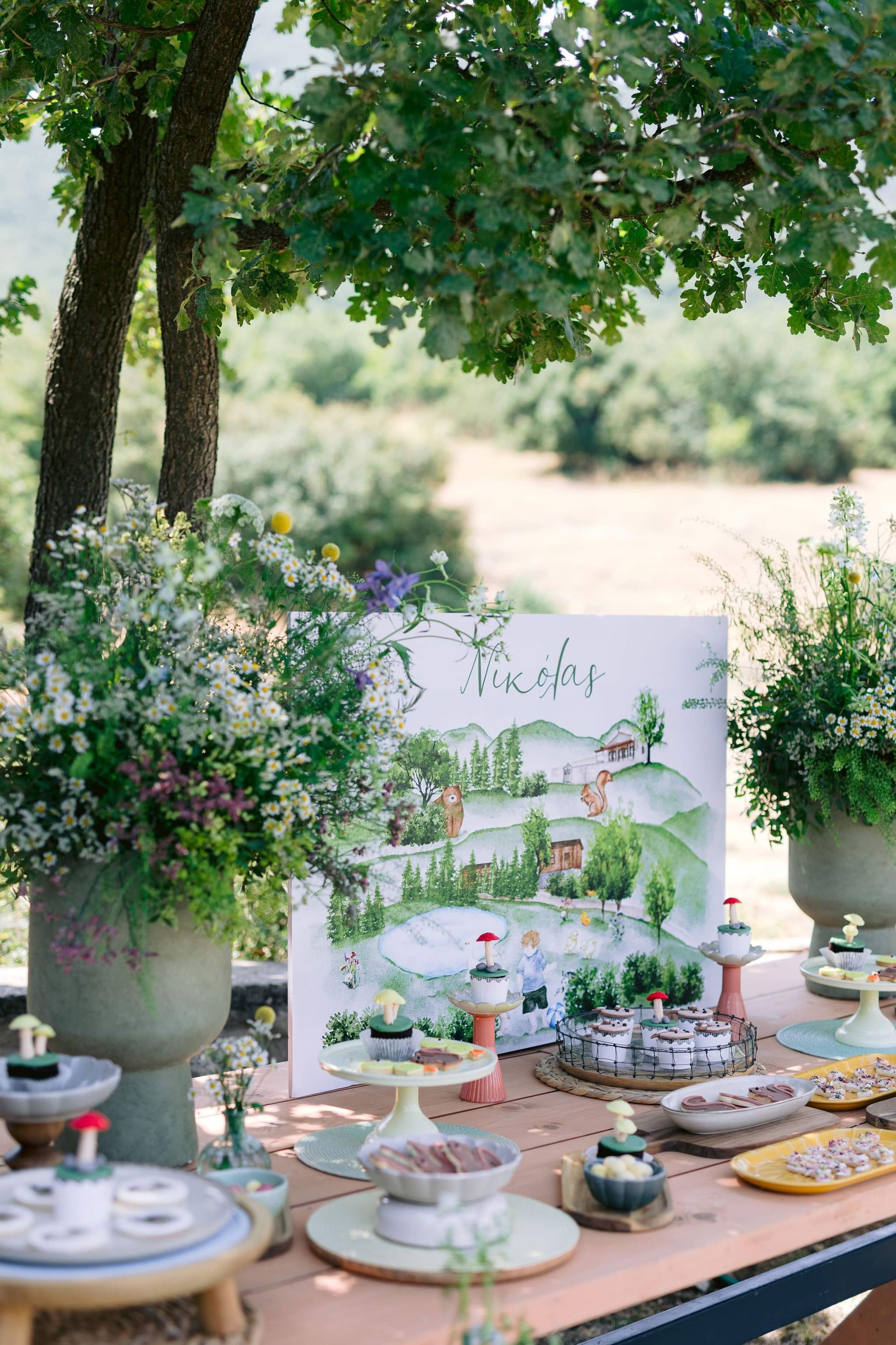 George and Micaela traveled to the beautiful Agistro of Serres, the birthplace of grandfather Nikos, to baptize their little son Nikolas. In the lush greenery of the wooden village, a picturesque chapel set the scene for a wonderful event with a refreshments and candy bar for their select guests. Micaela, the mother, wanted the baptism gifts to be unique: beautiful scarves with Nikolas' monogram for the women, boxes with sugar-coated almonds for the men, and large metal boxes filled with gifts for the children. The invitation and the favors were specially designed by Manousenia.