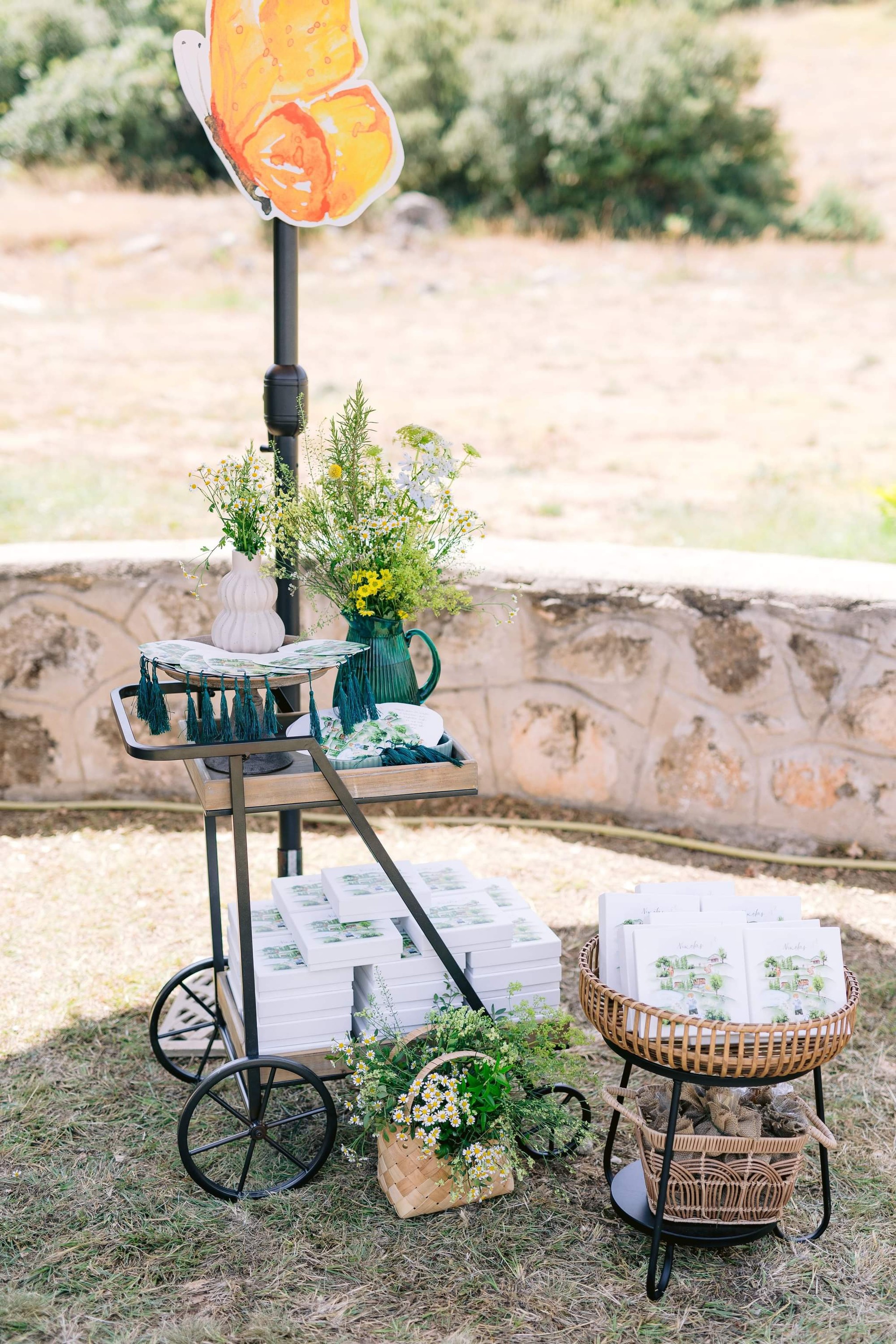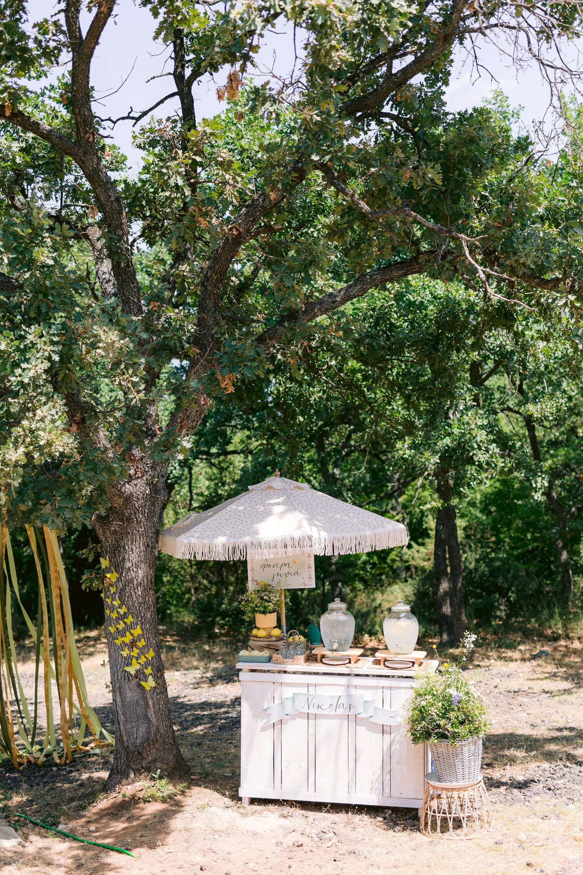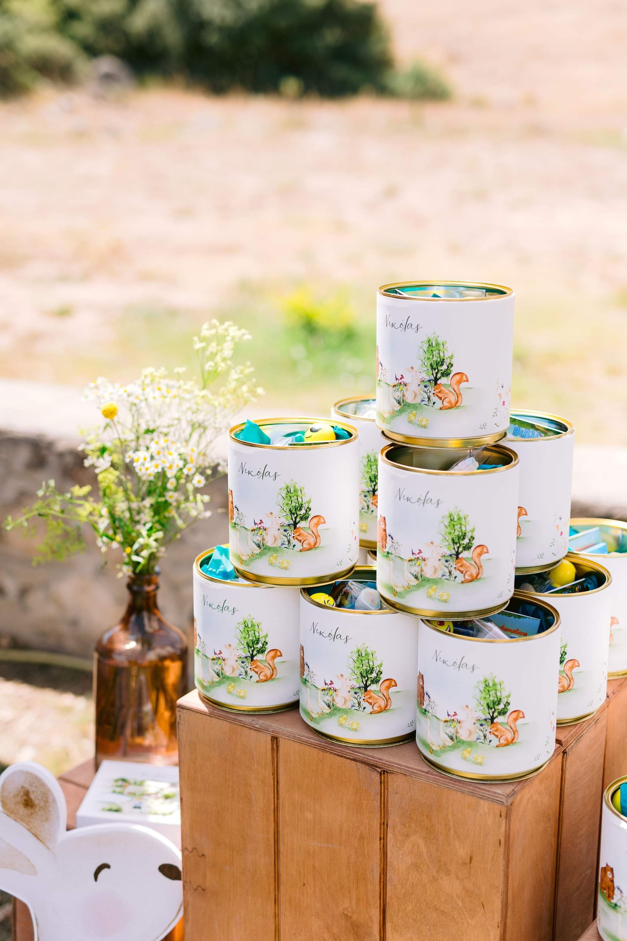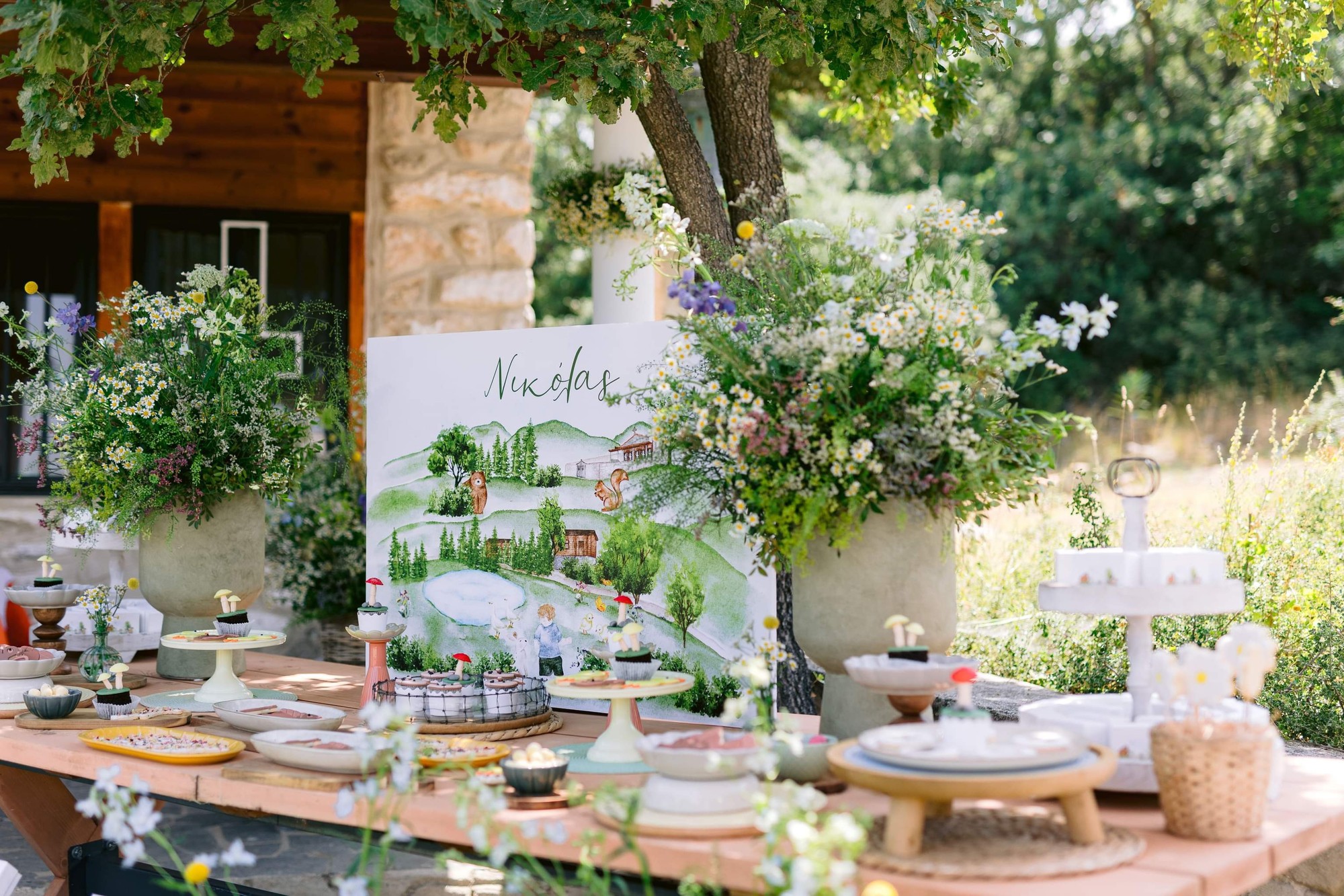 George and Micaela traveled to the beautiful Agistro of Serres, the birthplace of grandfather Nikos, to baptize their little son Nikolas. In the lush greenery of the wooden village, a picturesque chapel set the scene for a wonderful event with a refreshments and candy bar for their select guests. Micaela, the mother, wanted the baptism gifts to be unique: beautiful scarves with Nikolas' monogram for the women, boxes with sugar-coated almonds for the men, and large metal boxes filled with gifts for the children. The invitation and the favors were specially designed by Manousenia.