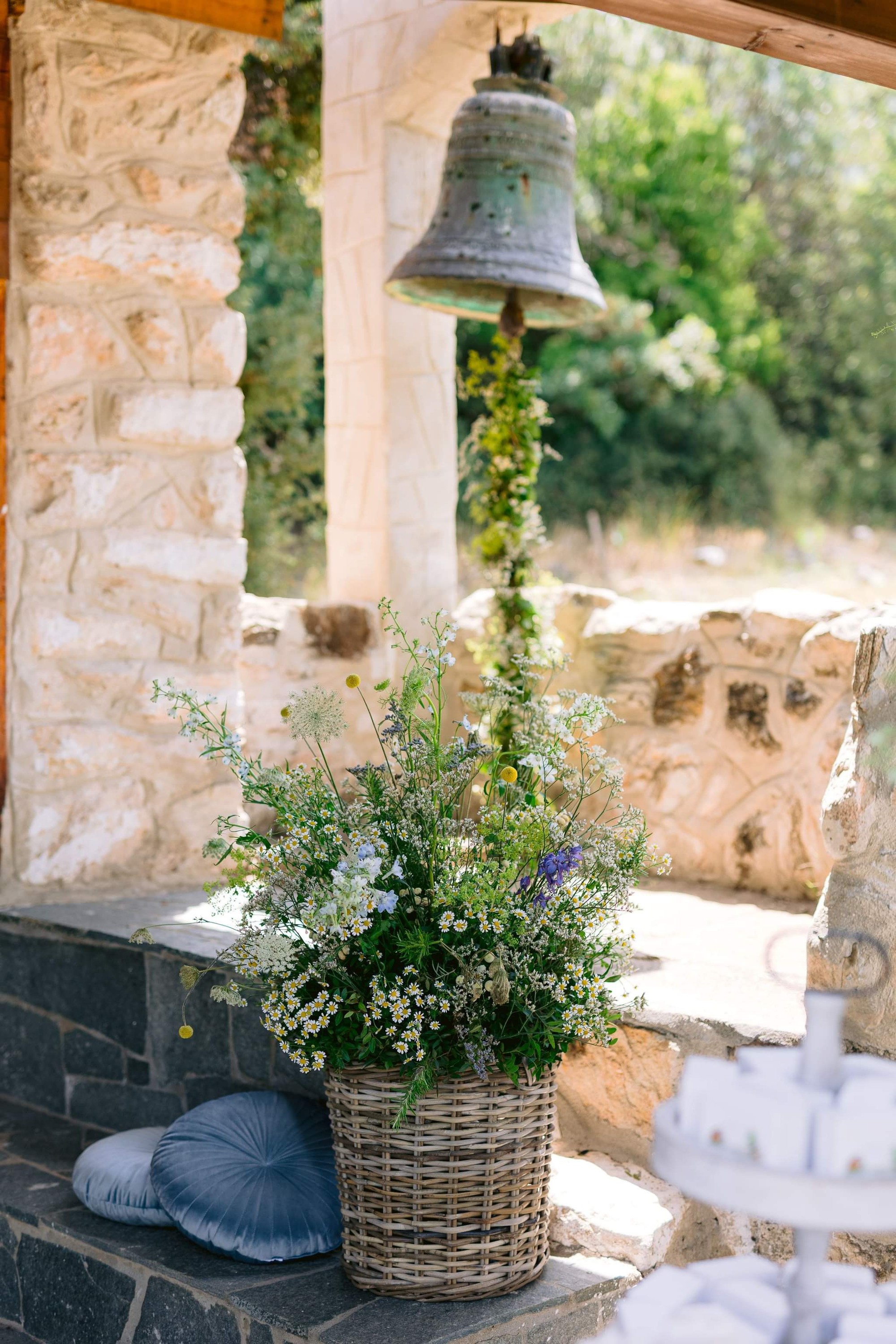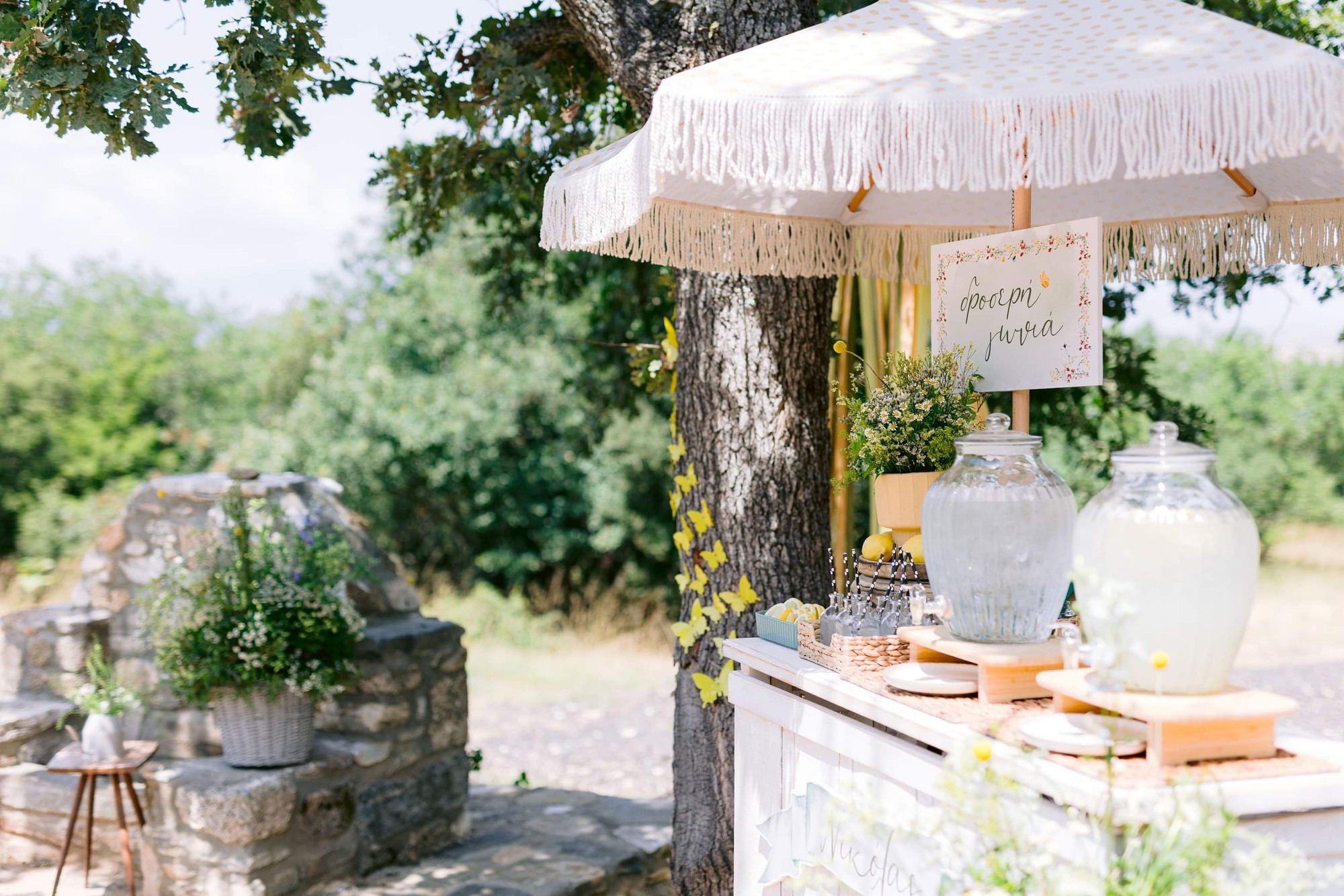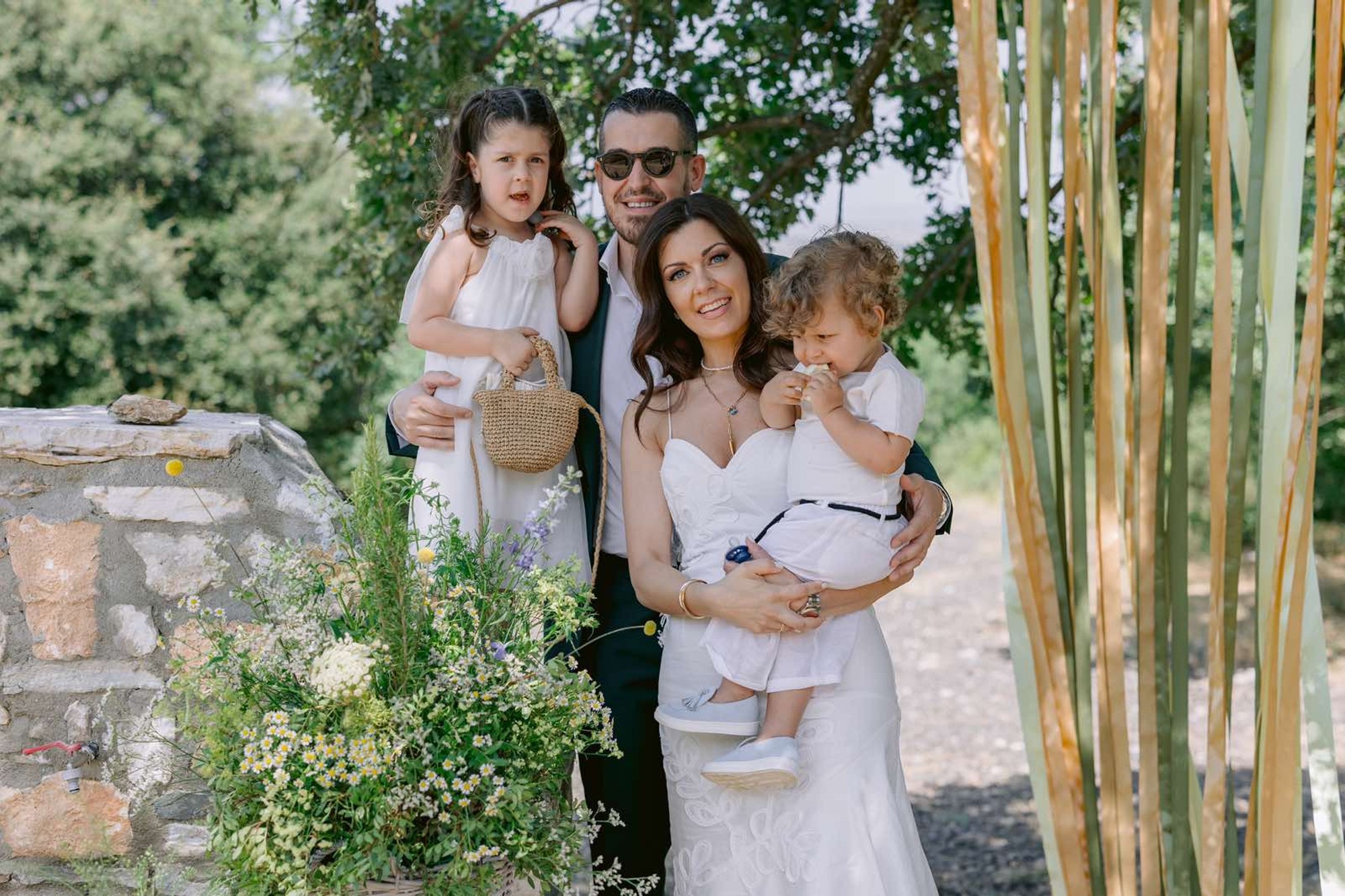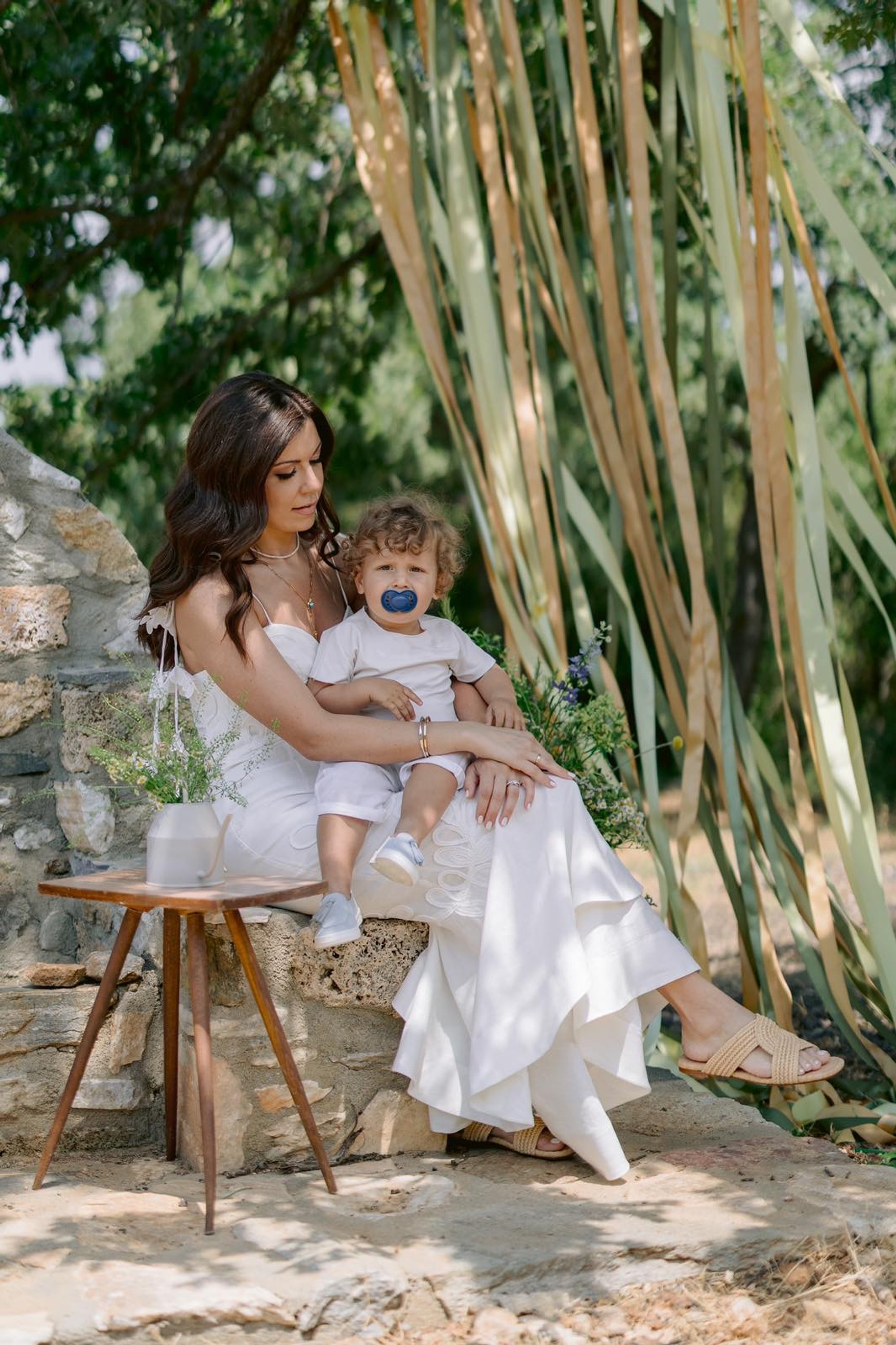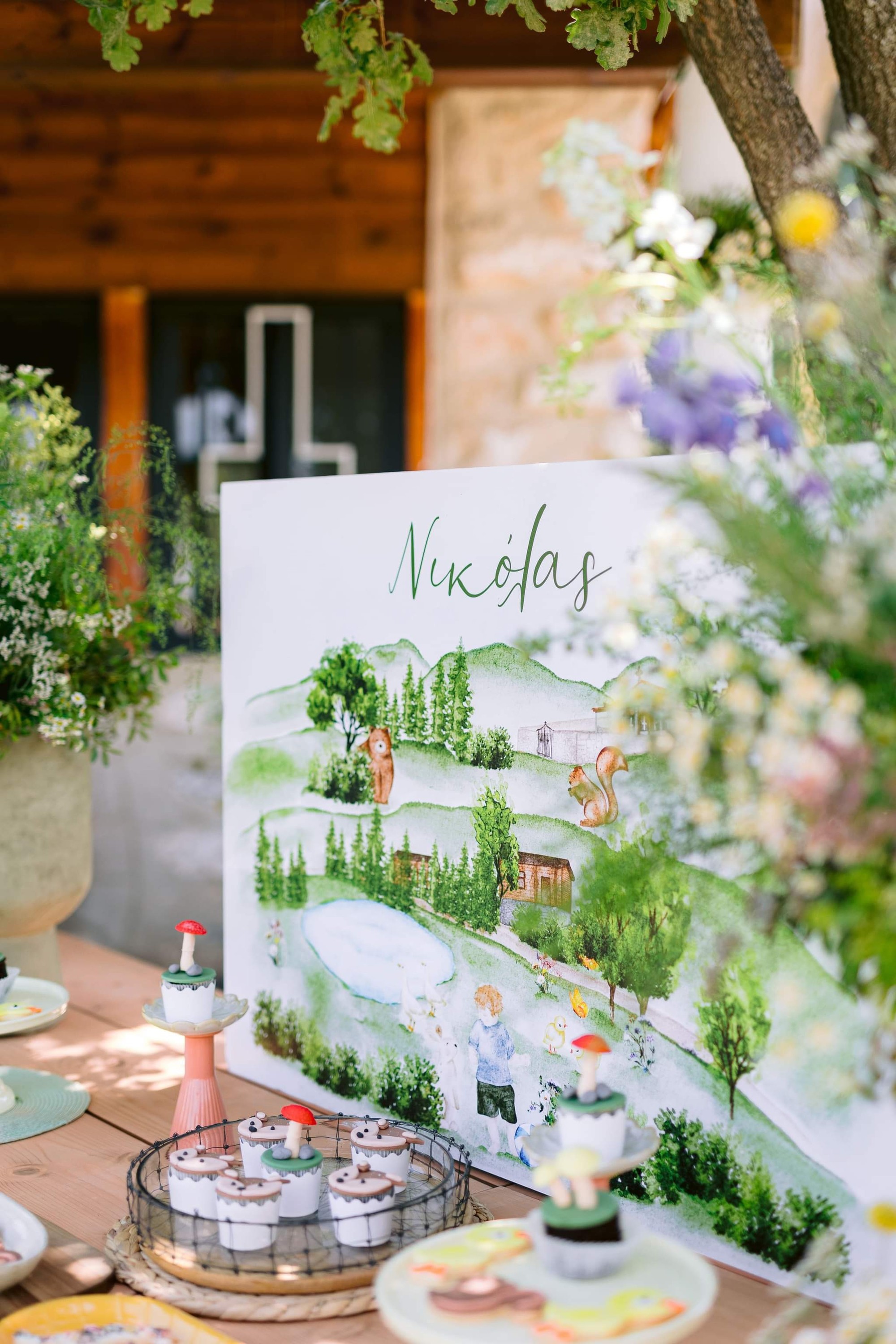 George and Micaela traveled to the beautiful Agistro of Serres, the birthplace of grandfather Nikos, to baptize their little son Nikolas. In the lush greenery of the wooden village, a picturesque chapel set the scene for a wonderful event with a refreshments and candy bar for their select guests. Micaela, the mother, wanted the baptism gifts to be unique: beautiful scarves with Nikolas' monogram for the women, boxes with sugar-coated almonds for the men, and large metal boxes filled with gifts for the children. The invitation and the favors were specially designed by Manousenia.