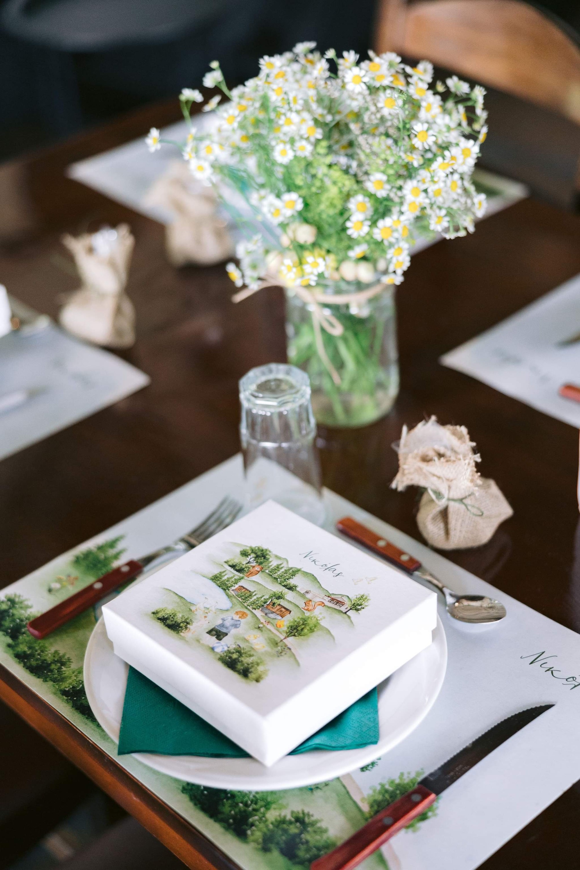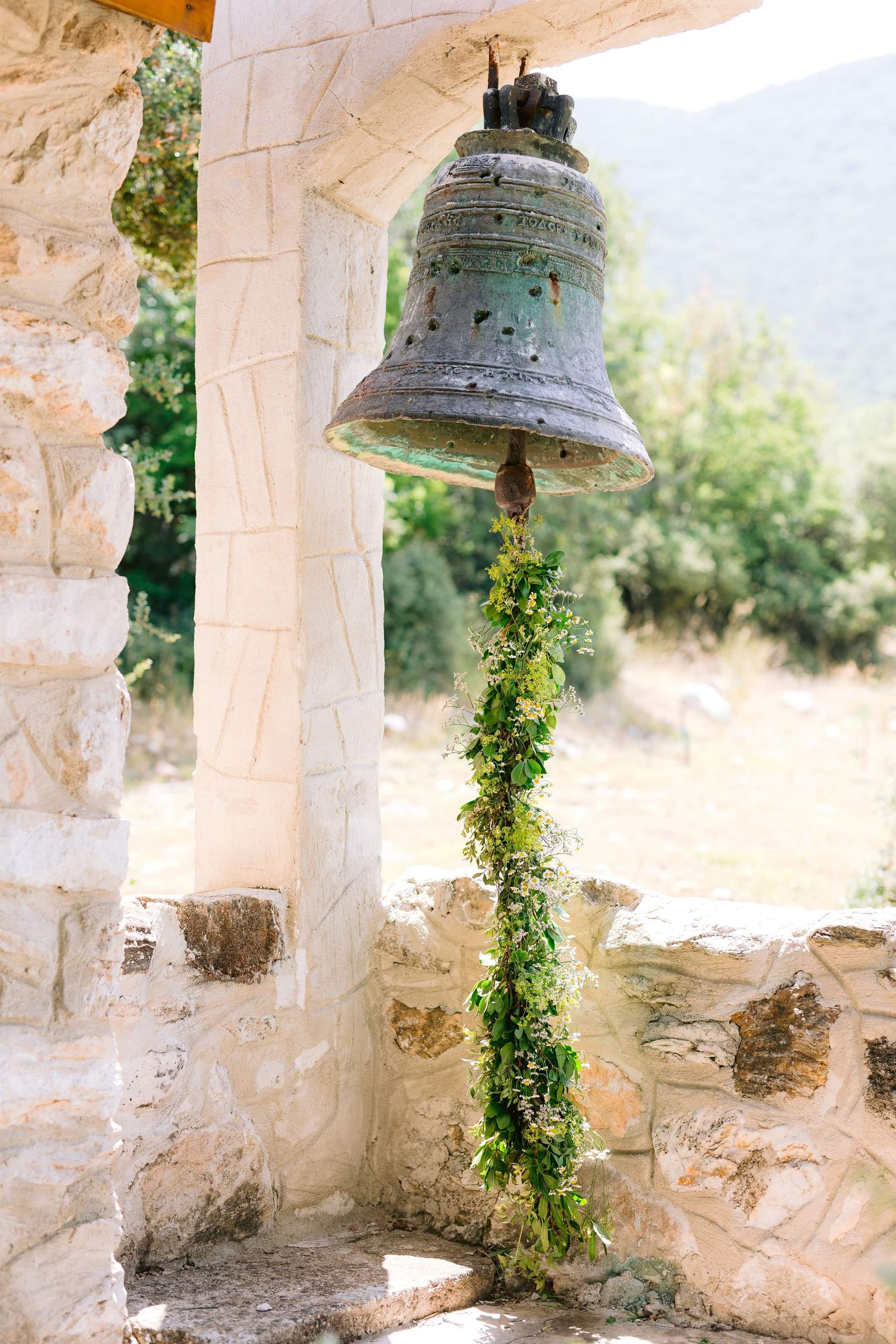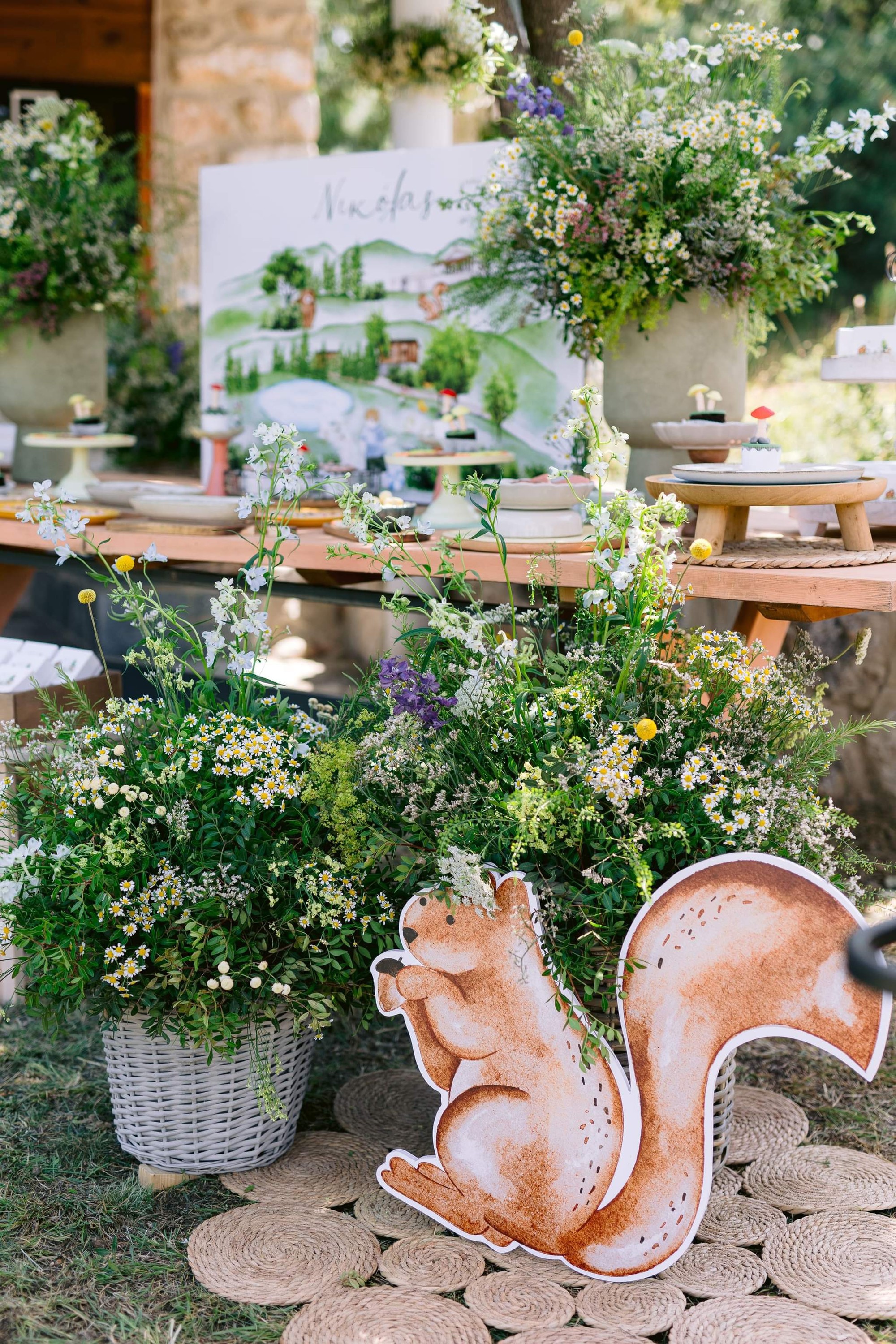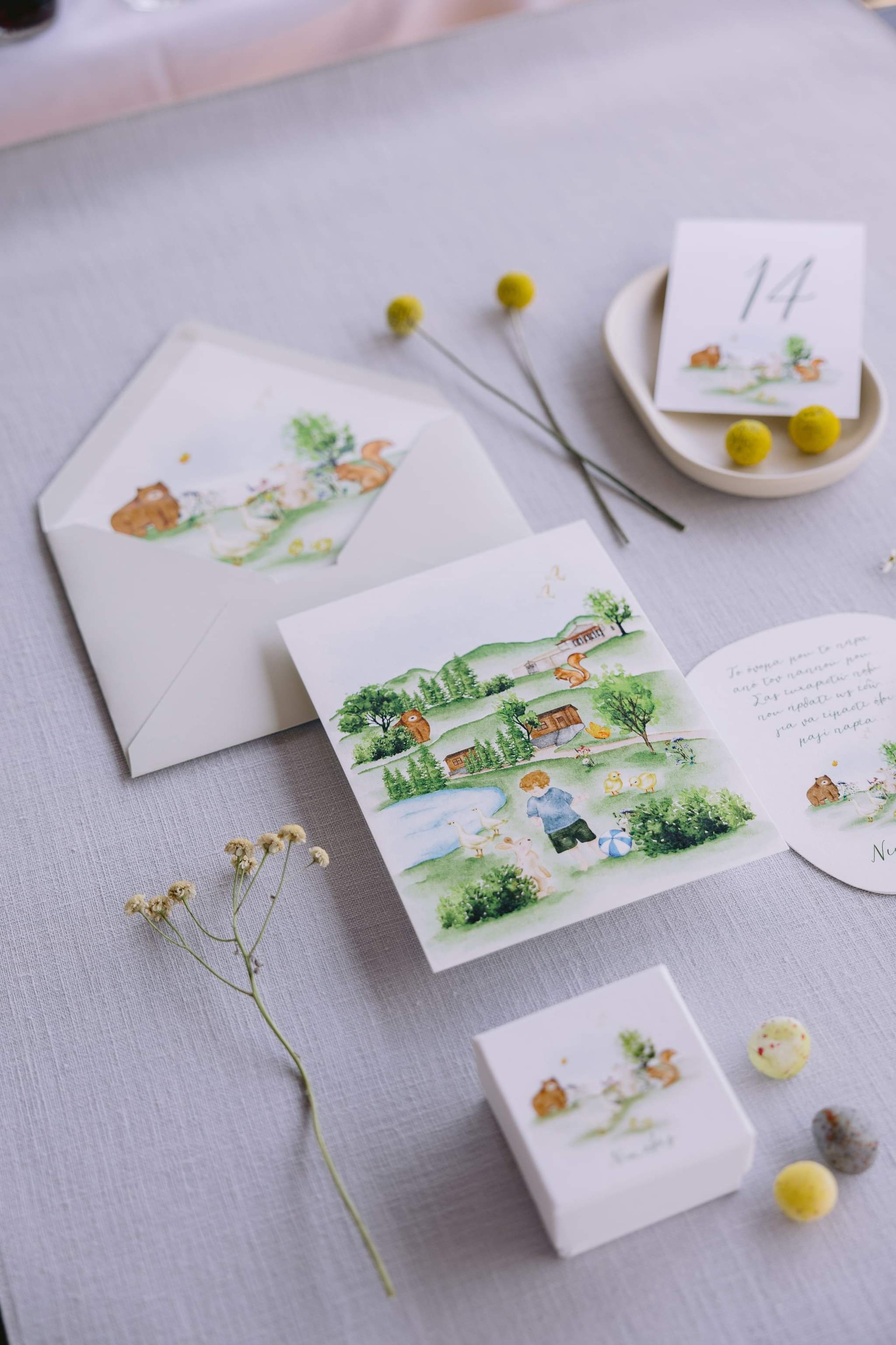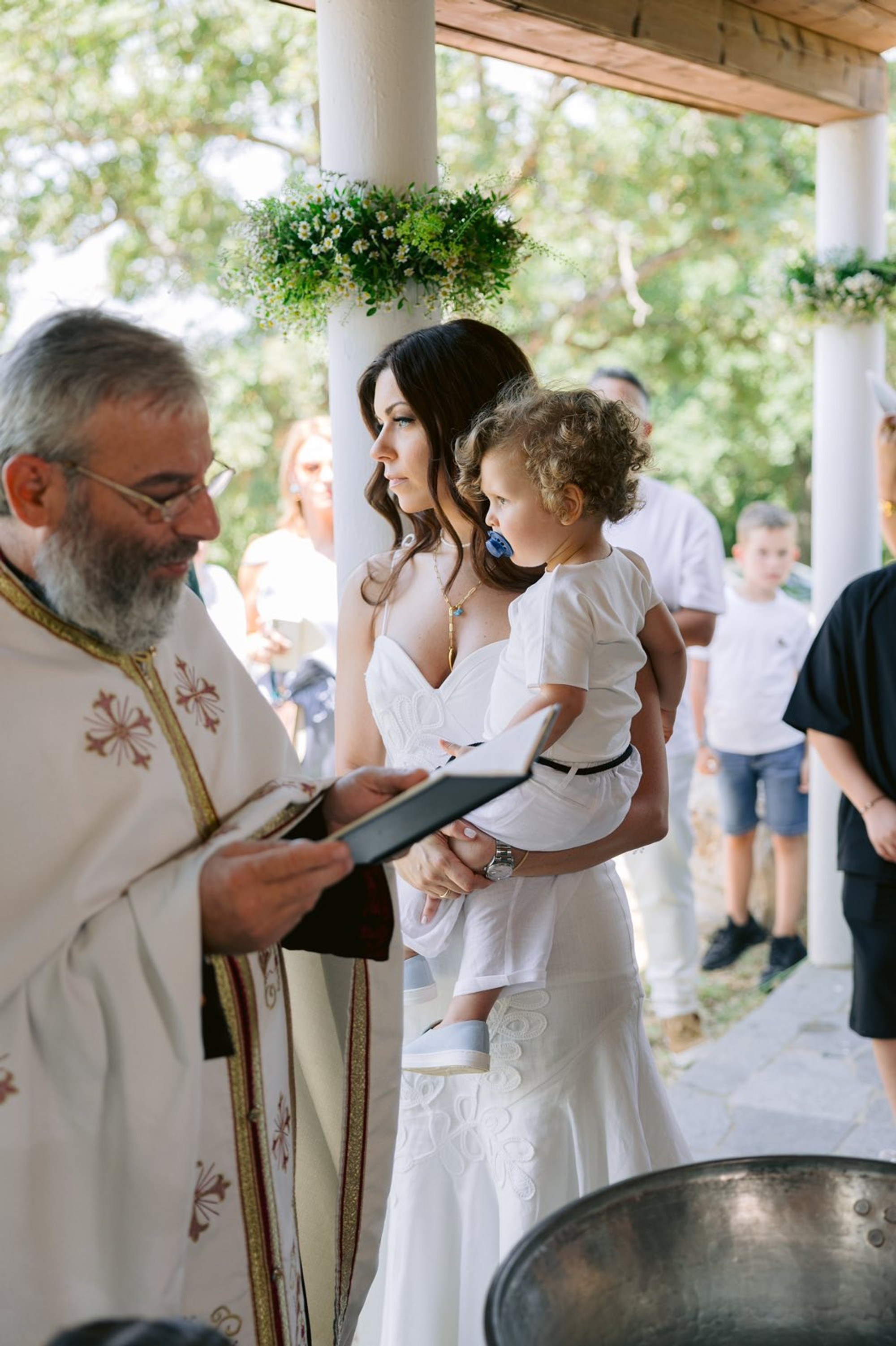 George and Micaela traveled to the beautiful Agistro of Serres, the birthplace of grandfather Nikos, to baptize their little son Nikolas. In the lush greenery of the wooden village, a picturesque chapel set the scene for a wonderful event with a refreshments and candy bar for their select guests. Micaela, the mother, wanted the baptism gifts to be unique: beautiful scarves with Nikolas' monogram for the women, boxes with sugar-coated almonds for the men, and large metal boxes filled with gifts for the children. The invitation and the favors were specially designed by Manousenia.