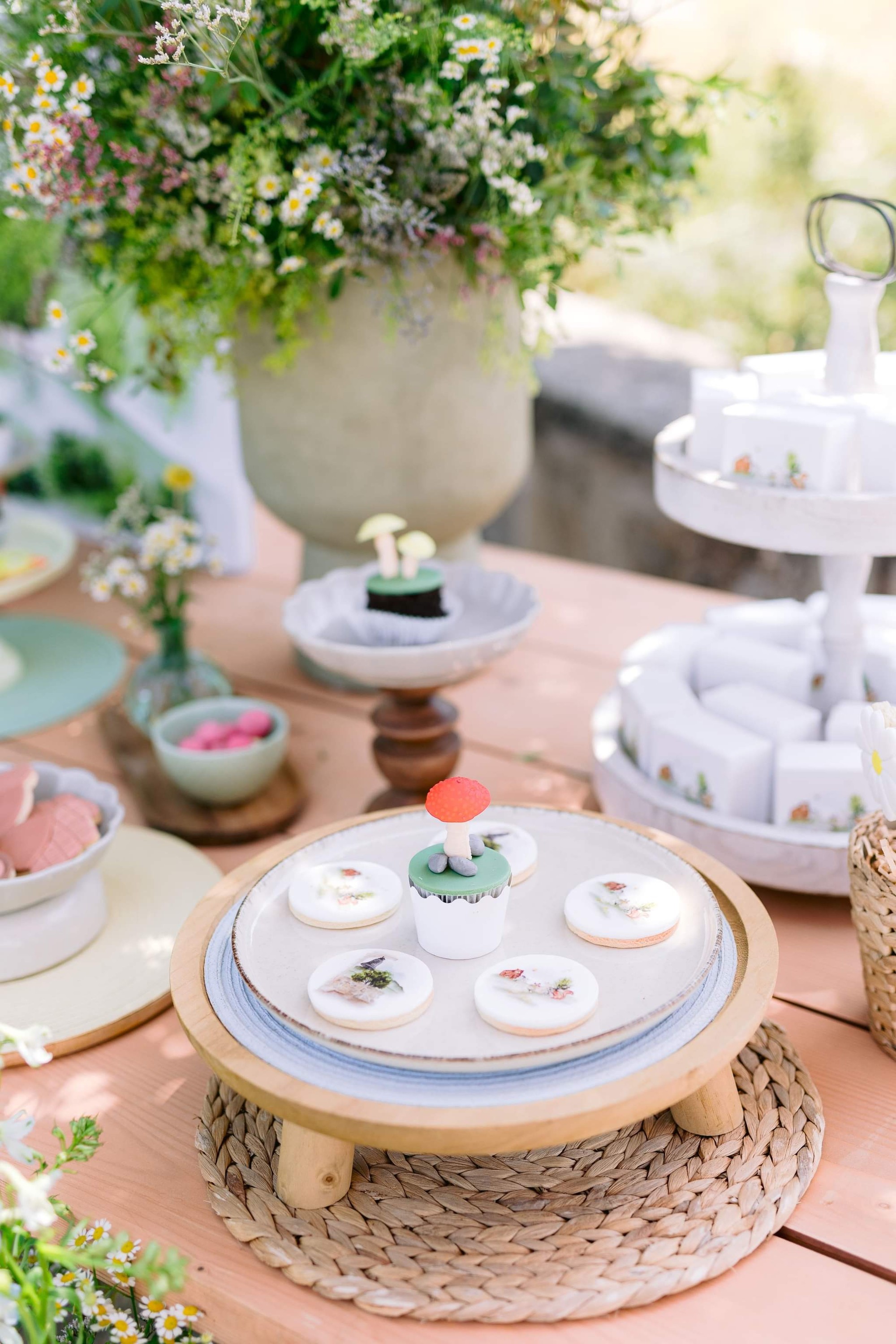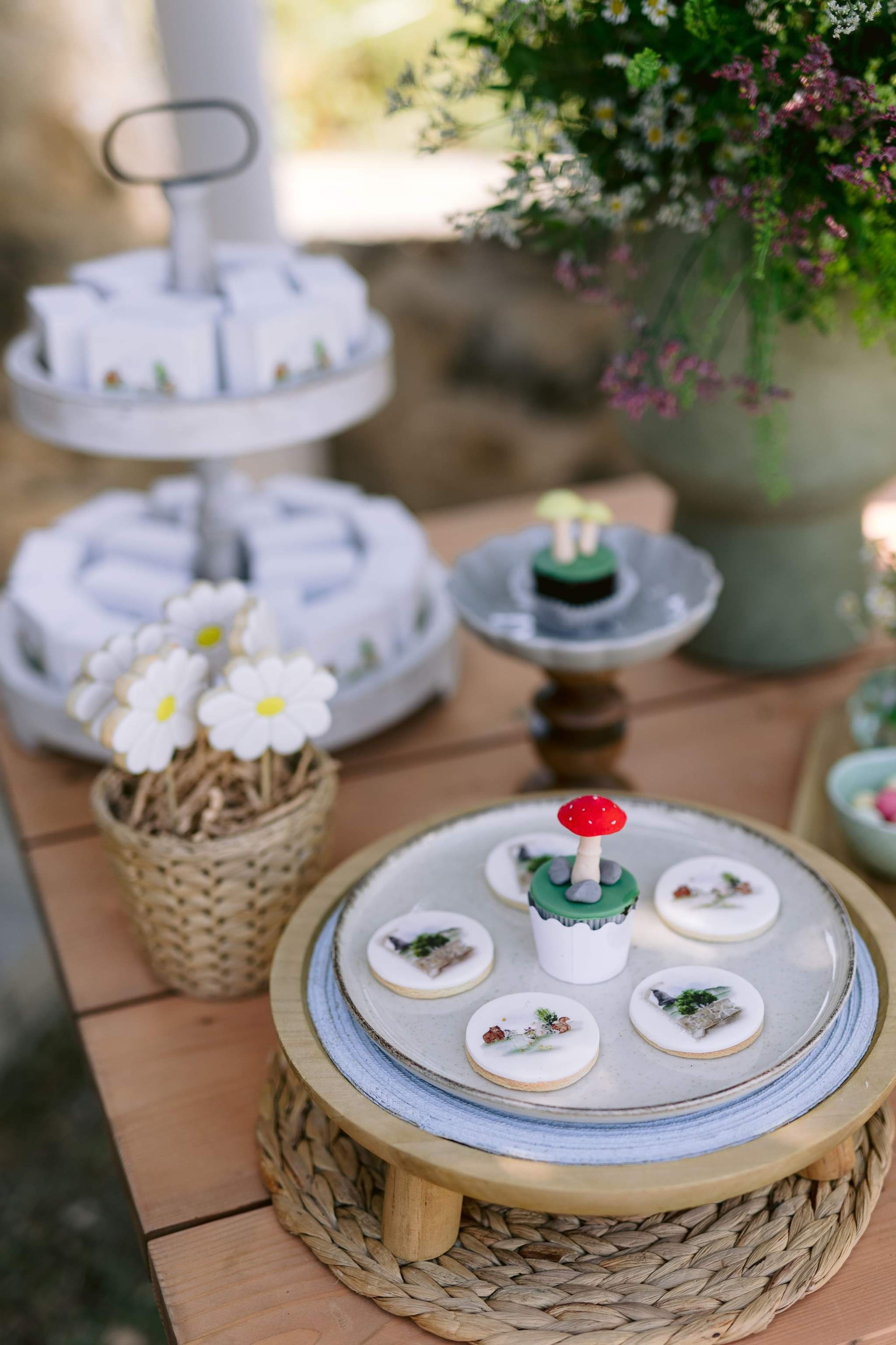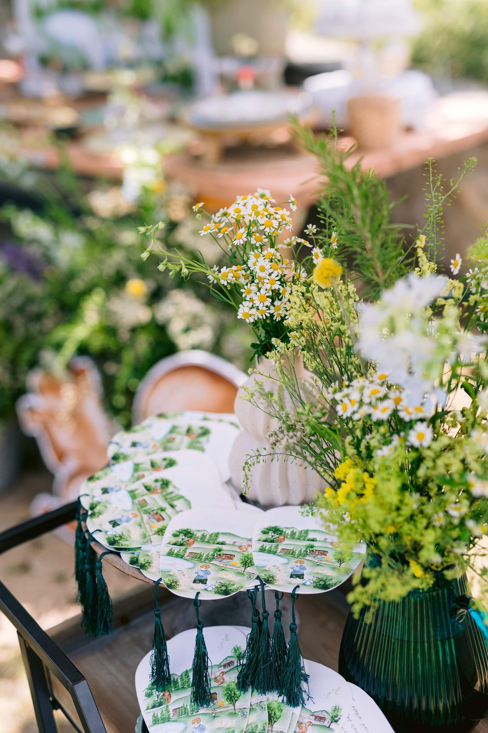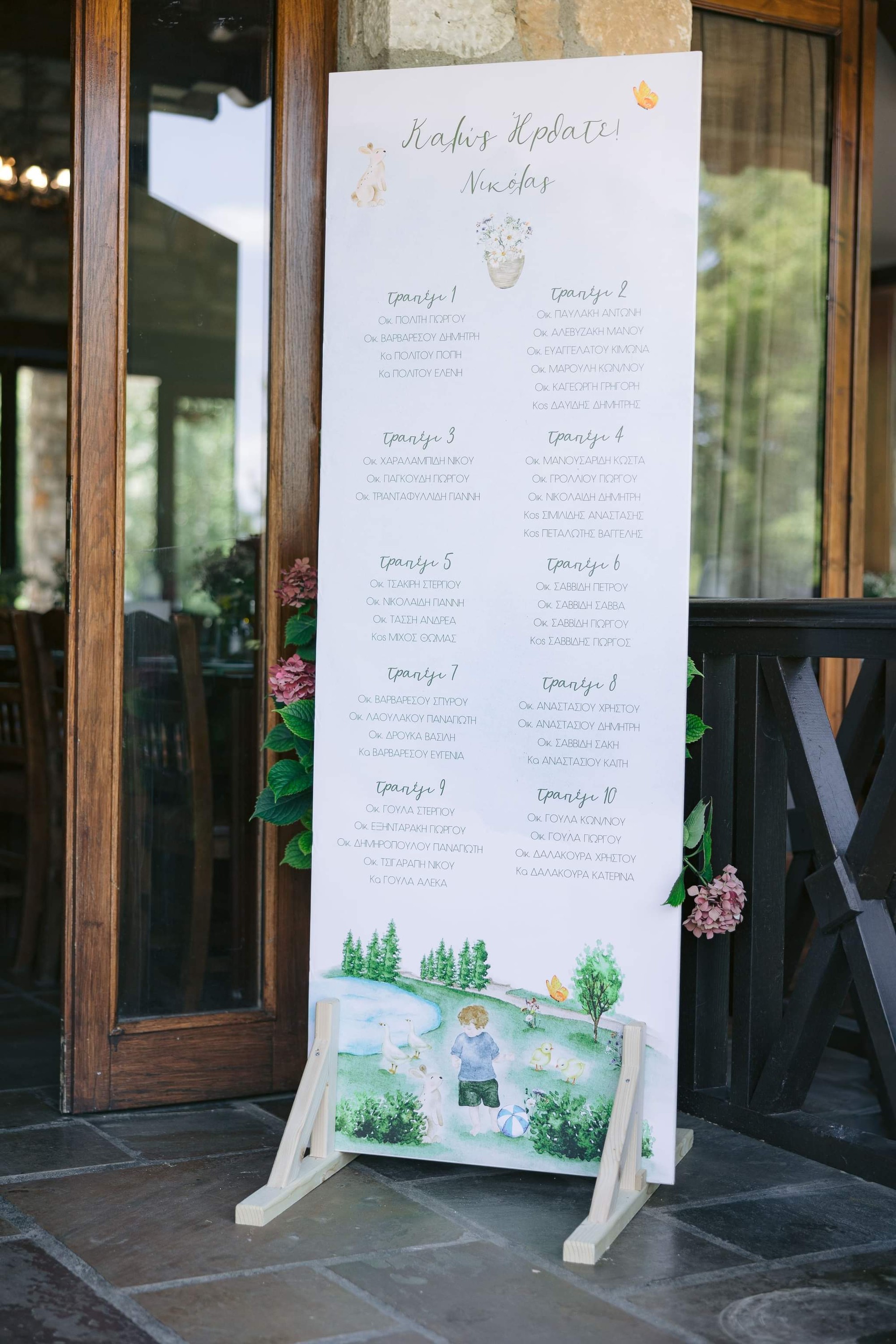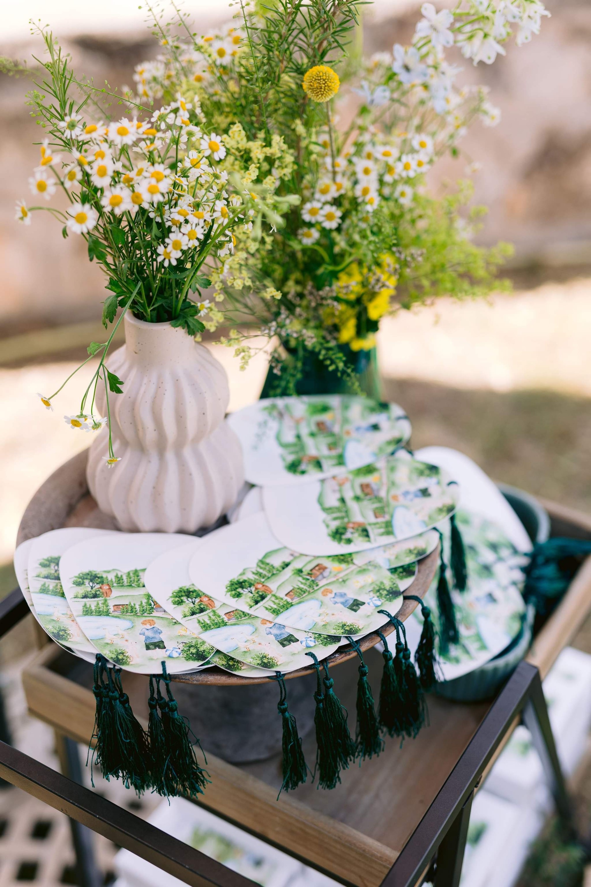 George and Micaela traveled to the beautiful Agistro of Serres, the birthplace of grandfather Nikos, to baptize their little son Nikolas. In the lush greenery of the wooden village, a picturesque chapel set the scene for a wonderful event with a refreshments and candy bar for their select guests. Micaela, the mother, wanted the baptism gifts to be unique: beautiful scarves with Nikolas' monogram for the women, boxes with sugar-coated almonds for the men, and large metal boxes filled with gifts for the children. The invitation and the favors were specially designed by Manousenia.